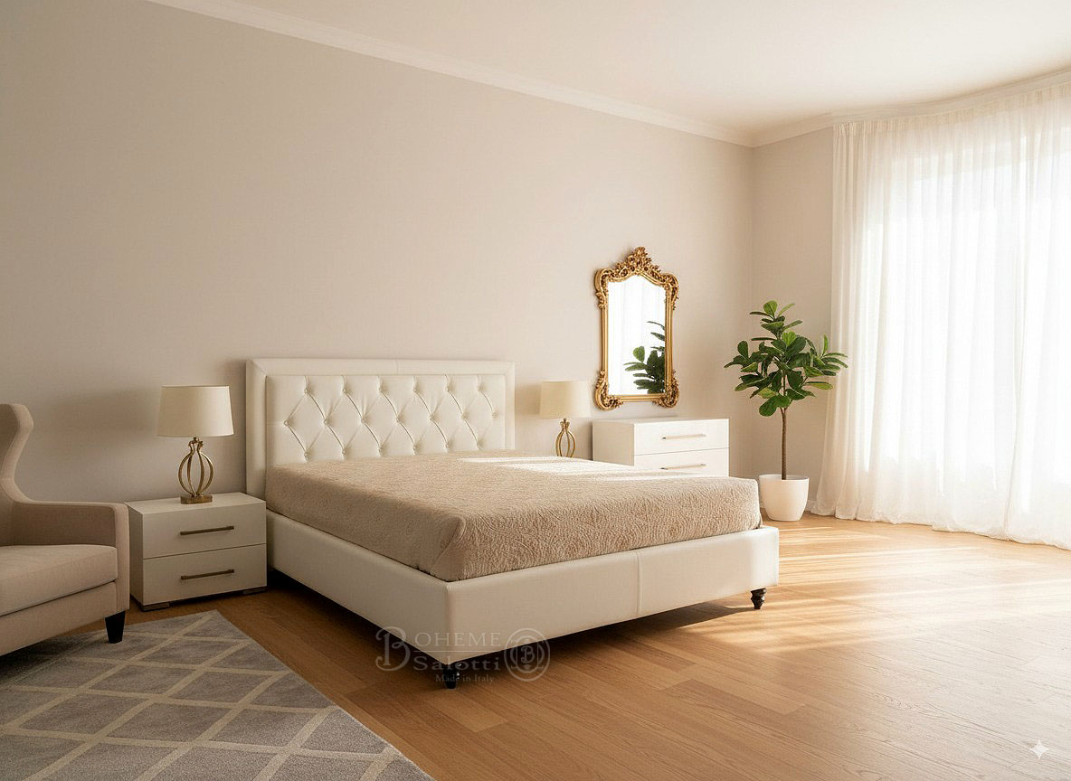 Letto matrimoniale con contenitore modello GLAMOUR H.154 L.190 P.219 cm. Giroletto e cornice in tessuto antimacchia col. Nabucco 64. Testiera in tessuto antimacchia col. Nabucco 14. Rete ortopedica a doghe 160x190cm con meccanismo a doppia alzata.