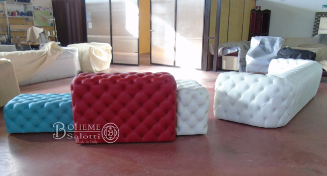 Pouf rettangolare o quadrato realizzato esclusivamente a mano con la tecnica capitonnè. Robusta struttura in legno, imbottitura in poliuretano espanso indeformabile. Rivestimento in pelle – tutti i colori e le tipologie.
